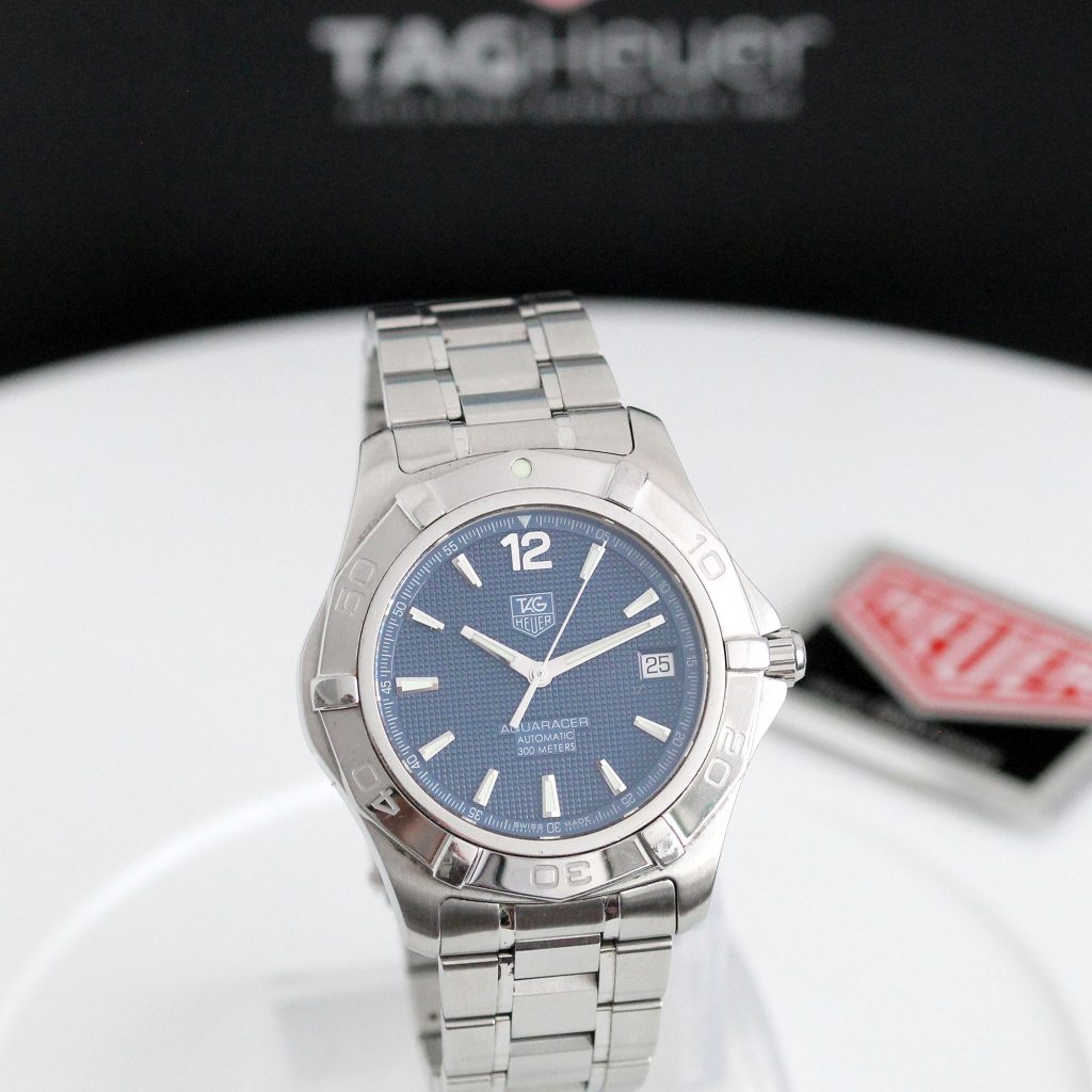 “The Tag Heuer 2008 Aquaracer watch features a striking blue dial with a square geometric pattern, housed in a 38mm silver case with a brushed finish. This Swiss-made timepiece is water-resistant up to 300 meters, making it ideal for both everyday wear and water sports activities. With a date indicator and Swiss mechanical automatic movement, this wristwatch combines style and functionality in a sporty design, perfect for any unisex adult or man looking for a reliable and stylish accessory.”