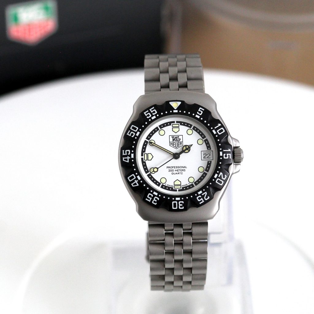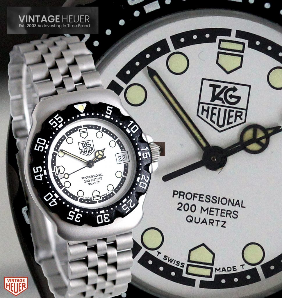 “An original F1 fun watch from the original owner. To a lot of people these watches are pure nostalgia, often the first watch bought before a lifetime of collecting! The recent re launch by Tag Heuer these watches have had some amazing attention from a new younger audience. This example is in fine condition, the white dial can be matched up to any coloured strap as a change to the lovely original bracelet .Original capstan box included. Great fun and value.”